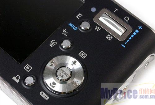 在按钮布局方面,由于NV3功能较多,所以大部分按钮都有复用的功能。在机身背面,分布着变焦/缩略图钮/音量钮、E效果钮、曝光补偿/删除钮、播放/打印机钮和5方向导航键。