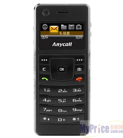 SGH-F308的手机面,除了必备的一个26万色176×65像素屏幕和手机键盘作为通话和文字输入使用,还在机身左上角设置了一枚200万像索CMOS摄像头,最大支持1600×1200像素的照片拍摄以及240×320像素动态视频录制。