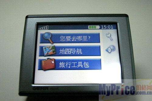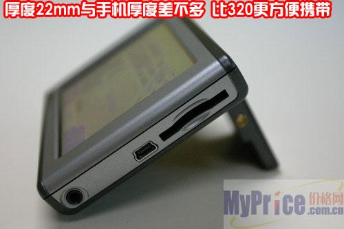 任我游Nuvi310正面为触控屏幕。可手写输入,反应速度适中。屏幕为高亮度,显示320x240。喇叭被安排机背后左右两边,而USB线、SD卡槽和电源接口都在机身右侧。操作都可以用手指完成,不需要触控笔这种碍手的东西。触控面为高透明光滑表面,所以用手写相当滑顺,不会有粗涩的感觉。