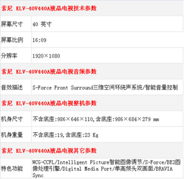 索尼KLV-40V440A采用10bit面板驱动技术,拥有1920×1080全高清分辨率,令色阶之间过度更加自然平滑均匀,细腻画质精彩呈现。特色的WCG-CCFL亮艳色彩背光源, 拓宽了色彩领域,使得BRAVIA液晶电视机的色彩表现更加宽广、饱和、亮艳,实现绚丽的色彩世界。BRAVIA ENGINE 2图像处理引擎,大大提升了画面处理能力,实现丰富生动的高画质。