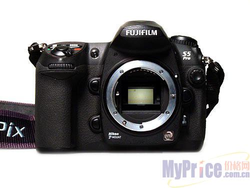 富士S5 pro采用的是尼康D200的机身,除了少数差别外,从整体外形到按键分布都和D200如出一辙。从正面看,内置闪光灯上的Nikon标志换成了 Fujifilm的新版标志,手柄处的红色三角标志变为黑色,靠右侧的铭牌换成了S5 pro,镜头卡口左下方多了“Nikon F-mount”字样,右下方则是富士超级CCD的标志。而背面除了品牌LOGO和液晶显示屏左侧的按键功能稍有变化,其他的完全相同。