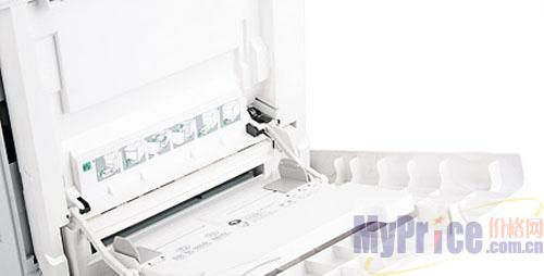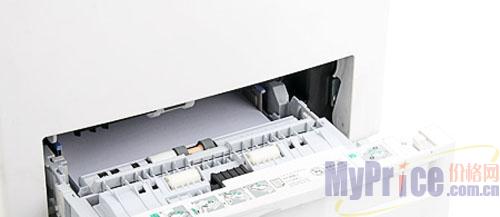 前置手动进纸单元的上方,有详细的清除卡纸步骤的图形标识,人性化设计相当好。内置的独立纸盒为全封闭设计,纸盒外缘还有纸张的安装方式,在此体现出较好的人性化设计。内置纸盒的容量为250页,唯一的不足是没有设计纸张计量器,用户无法从外面得知纸盒内的纸张剩余。