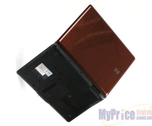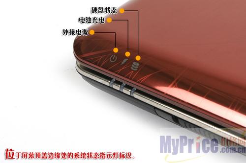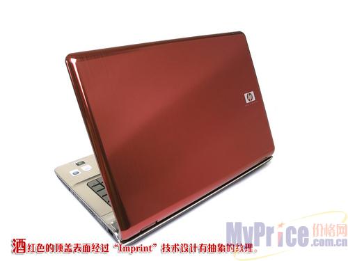 笔记本的顶盖表面可以说是这款惠普dv6812TX的最大特点,整机表面采用了酒红色的作为主色调进行涂装,并且依靠Imprint技术实现了抽象的底纹效果以及较高的耐磨抗划能力。