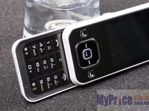 按键方面,面板上仅有音乐播放键与左右选择软键,拨出与挂断需推开上盖。数字按键的设计整体精美,配合镜面金属感极强相当具有个性,且整个按键的设计也都相当合理适手。位于屏幕上方的长条孔既是听筒也是扬声器,这也说明三星F258并没有独立扬声器。