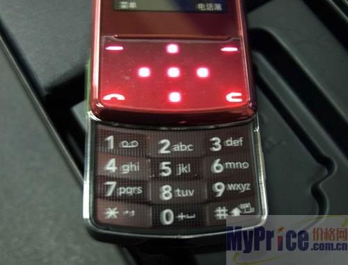 LG KF510继续采用了触摸按键的设计,特别的是触摸按键的为LED动态触控面板,闪灯效果有这多种的组合变化,添加了力反馈技术之后,触摸手感有了很大的提升,整机的滑盖手感很优秀,推开滑盖后整体的观感很好,巧克力的感觉非常突出,相信是众多MM的喜欢之作。