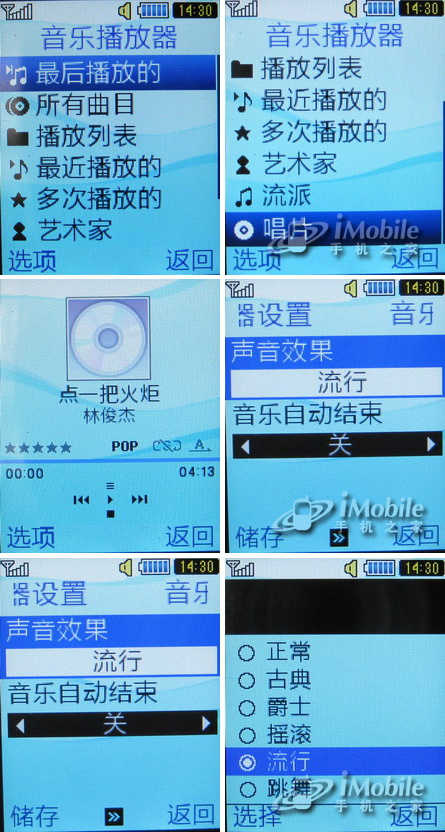 S3030C的播放界面和功能方面设计的比较简单。在播放功能方面除去支持音乐随机、循环和背景播放等模式以外,在音乐播放器的设定菜单内,还提供六种预置均衡供用户选择,同时还有自动音乐结束功能。