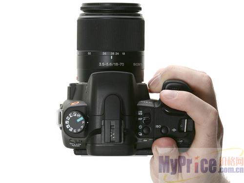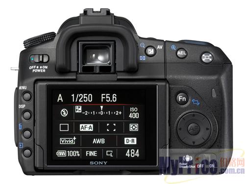 索尼α350机身看起来很厚实,130.8×98.5×74.7mm,582g的净重拿在手里很有份量。机身背面提供了一块2.7英寸23万像素的液晶屏,屏幕支持向上和向下一定角度的翻转,搭配实时取景功能,可以方便的捕捉仰角或者低位的图像。