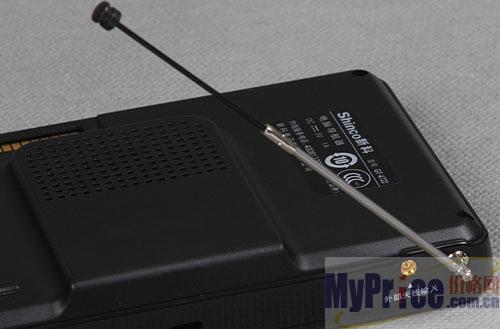新科GT-4722正面除了采用一块分辨率为480x272的4.7寸液晶触摸屏外,左侧从上到下分别为组合警示灯和充电指示灯。顶部除了带有一个开关/主菜单双功能按键外,靠右侧的地方为4段伸缩式CMMB电视天线和外置GPS天线接口。