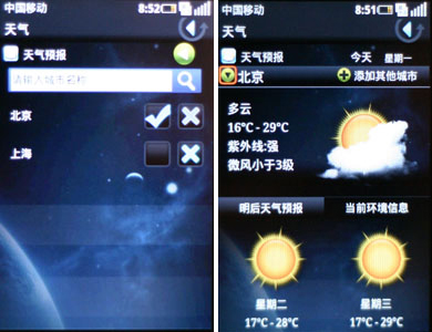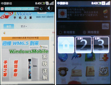 虽然O1不支持多点触控,但是我们依然可以再该机上体会到类似于iPhone的滑动感觉,滑动时顺畅平滑,并且待机界面支持两种炫目的切换效果:“卡片”和“立方体”。 除了应用程序图标之外,用户还能为桌面上添加书签和通讯录的快捷方式。