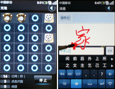 在信息方面,联想O1采用了流行的短信对话形式,在显示彩信时则可以直接向下滚动就可以依次显示全部而不用翻页。联想O1内置了全键盘输入法、全屏手写输入法以及4*4键盘输入法也就是常见的9键数字键盘。