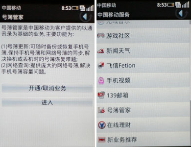 联想O1作为中国移动定制手机,那么我们可以在O1中随处见到中国移动的影子,包括快讯、飞信、音乐随身听、139邮箱、移动梦网、手机导航、号薄管家等。其中快讯、飞信、移动梦网都是大家比较熟悉的功能,而音乐随身听、139邮箱、手机导航和号薄管家则是比较新一些的业务。