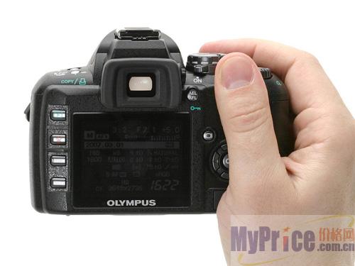 奥林巴斯E-410的三维尺寸为130 x 91 x 53 mm,体重约为435g,数据显示E-410比E-510偏小偏轻。E-410的主要缺陷就是几乎没有手柄,导致拍摄时的握持性不如E-510好。奥林巴斯E-410背面装载了一块2.5英寸,21.5万象素的液晶显示屏。