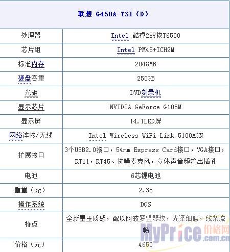 联想 3000 G450(A-TSI)『参考报价』:¥4300.00 立即购买『推荐商家』:IT在线商城『联系电话』:010-58424900,58424897,59444899 『联 系 人』:销售部『报价查询』:笔记本 lenovo/联想