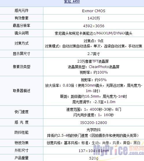 索尼 a450『参考报价』:¥3450.00 立即购买『推荐商家』:中关村摄影器材城『联系电话』:010-82483683 13717620173『联 系 人』:夏立峰『报价查询』:数码相机 SONY/索尼