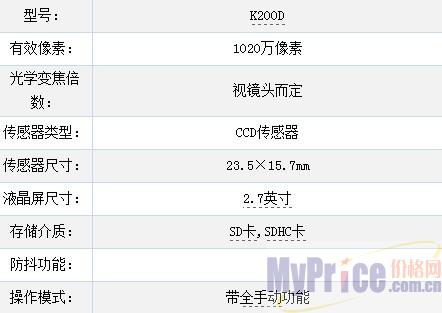 整体机身以黑色为主,整体尺寸为133.5x95x74mm,在采用了高硬度不锈钢框架和加厚的工程塑胶壳体后,尽重630g,机身壳体和60多个零部件均使用了特殊封装处理,这使其防尘防滴渗能力明显优于其他新生代入门机型。 K200D将尖端的PRIME(PENTAX Real Image Engine)作为其成像引擎,并将高性能的23.5mm x 15.7mm大尺寸CCD摄像元件与之结合使用。K200D的有效像素高达1020万,可以更精细地再现层次和纹理,并形成漂亮、无瑕疵的影像。其独创的SR(防抖)机构可以确保清晰、不模糊的图像。K200D搭载了宾得PRIME(PENTAX Real Image Engine)图像处理引擎,支持JPG和RAW两种格式,机身也增加了感光度优先拍摄模式和诸多其他拍摄模式。