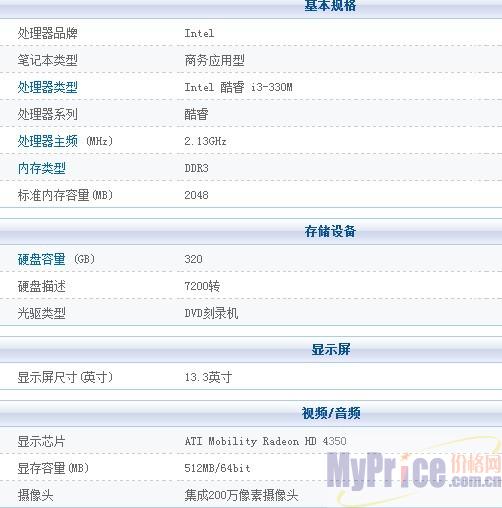 这款HP4321s采用32纳米工艺的Intel 酷睿 i3-330M双核处理器,主频2.13GHz,3M三级缓存,并且这款处理器还集成了存储控制器,全新性能蓄势待发。内存是时下流行的DDR3 2048 2G,7200转高速硬盘和桌面级有的一拼,告别普通的5400转,大大提升工作处理效率。系统方面,预装Windows 7 Home Basic操作系统。 编者总评:作为一款中端机型,HP4321s在配置上不容小觑,作为商务必备机,4小时的续航能力能满足你的一般工作需求。