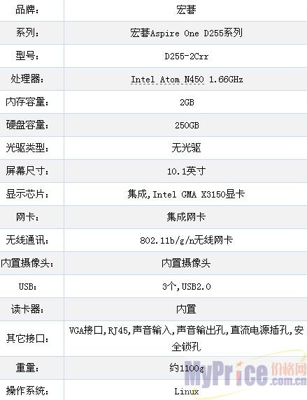 编者总评:宏基 Aspire One D255-2Crr(2G)的总体性能还是很不错的,2599的价格采用Intel Atom N450处理器,其硬件配置还算主流。