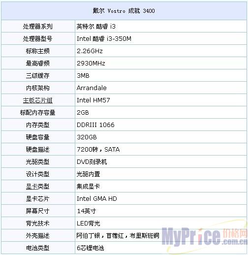 配置上,DELL Vostro 成就 3400采用Intel Core i3-350M处理器、Intel HM57芯片组、标配2GB DDR3内存、320GB硬盘和Intel集成显卡。预装Windows 7 家庭普通版操作系统,内置200万摄像头。接口方面,为用户提供了3个USB 2.0接口、1个eSATA/USB混合接口、RJ-45接口、HDMI接口、VGA端口、耳机麦克风插孔、ExpressCard插槽和多合一读卡器。