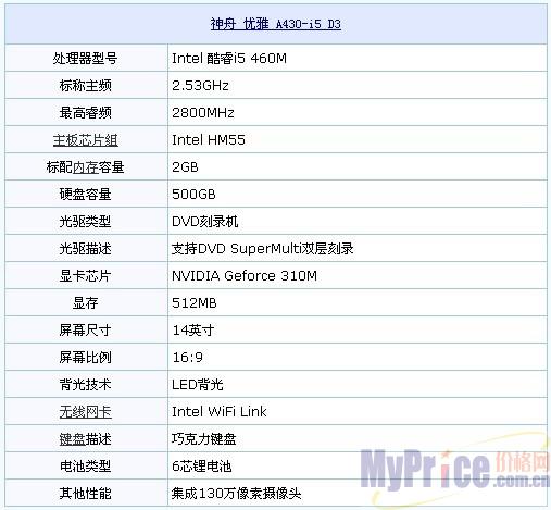 配置上,神舟 优雅A430-i5 D3搭载了Intel酷睿i5 460M双核四线程处理器(主频2.53GHz、3M三级缓存、支持睿频加速)、搭载HM55芯片组、2GB DDR3内存、320GB硬盘、DVD刻录光驱以及NVIDIA Geforce G310M独立显卡,整体在运行目前主流游戏方面都没有问题。网络方面,这款本内置了802.11b/g/n(300Mbps)千兆以太网卡。 接口方面,提供了2个USB 2.0接口、1个eSATA/USB两用接口RJ-45接口、HDMI接口、VGA端口、耳机麦克风插孔、ExpressCard插槽和四合一读卡器。