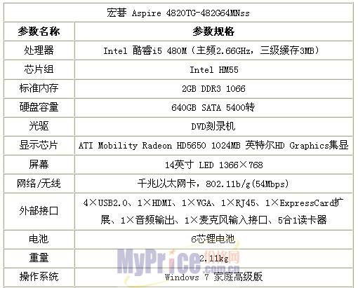 性能上,宏? Aspire 4820TG-482G64MNss采用了Intel Core i5-480M处理器,搭载Intel HM55芯片组,显卡则采用了1GB GDDR3显存的ATI Mobility Radeon HD 5650独立显卡,配2GB的DDR3内存和640G硬盘,DVD刻录机,14英寸宽屏,6芯锂电池,预装Windows 7 Home Premium系统。 接口方面,该本侧边设有4个USB 2.0、VGA输出、RJ-45、耳机孔、麦克风孔等基本接口,另外还设有5合1(MMC、SD、MS、MS Pro、xD)的读卡器、以及HDMI输出,足够日常生活的使用了。