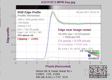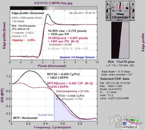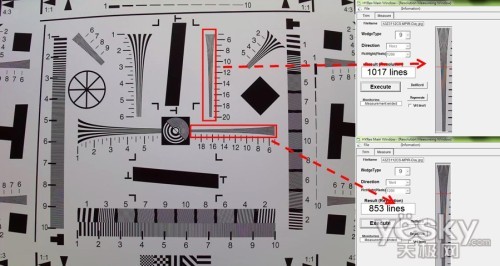 在清晰度测试中,选择H.264压缩格式,将分辨率设为2百万高清1600x1200,帧率15帧,对比高清分辨率测试卡,此时水平清晰度达到1000线以上。这对于许多只有6~700线的网络摄像机来说是处于遥遥领先的水平的。