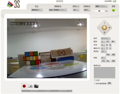 3S N1072网络摄像机的IE操作界面简洁易用。在浏览界面下就可选择不同的码流以适应不同的网络环境,还可根据屏幕的大小选择浏览尺寸。除此之外,还能够通过鼠标滚轮对图像局部区域放大。云镜控制、抓拍、录像、移动侦测、遮挡侦测、隐私遮挡等功能一应具有。