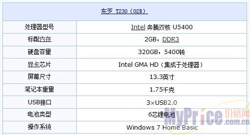 东芝 Portege T230-02B配备Intel 奔腾 U5400双核处理器(1.2GHz主频)、Intel HM55芯片组、2GB DDR3内存、320GB硬盘和Intel HD Graphics集成显卡。机身尺寸为223×322×26.2mm,机体重量为1.75kg,它采用13.3英寸LED背光屏、最大分辨率为1366×768像素。