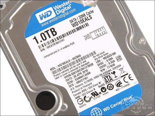 西部数据 1TB SATAII 32M(WD10EALS)/蓝盘采用蓝色标签,表明其属于蓝盘系列,定位主流用户。从标签上可以看到,这款西数1TB蓝盘型号为“WD10EALS”,拥有32MB缓存,工作电压、生产日期等信息也很详细,但用户很关心的单碟容量大小及封装碟数在标签上并不能找到,官网也没给出相关信息,这点西数一直没有改进。不过从后面的测试成绩可以判断,这款新版的1TB蓝盘是采用单碟500G设计,双碟封装的。