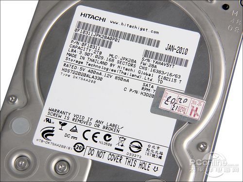 从硬盘标签数据标识可以看出,日立 2TB SATA2 32M(HDS722020ALA330)容量达到目前单硬盘最大的2TB容量,转速为主流的7200RPM,采用SATA 3Gb/s接口,产地为泰国。