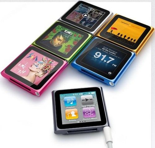 产品介绍:iPod nano 6(报价 参数 评测 图库)的机身三围尺寸为37.5×40.9×8.78毫米,重21.1克,搭载了1.54英寸、240×240像素触控显示屏。支持音频格式有AAC、受保护AAC、HE-AAC、MP3、MP3 VBR、Audible、Apple Lossless、AIFF以及WAV。该机内置FM收音机功能,可暂停电台广播和倒带的实时暂停功能。内置可充电式锂电池,电池充满时最长24小时音乐播放时间。