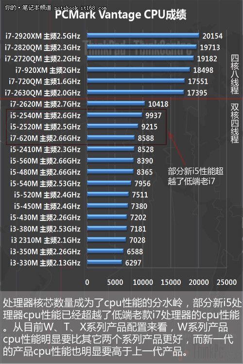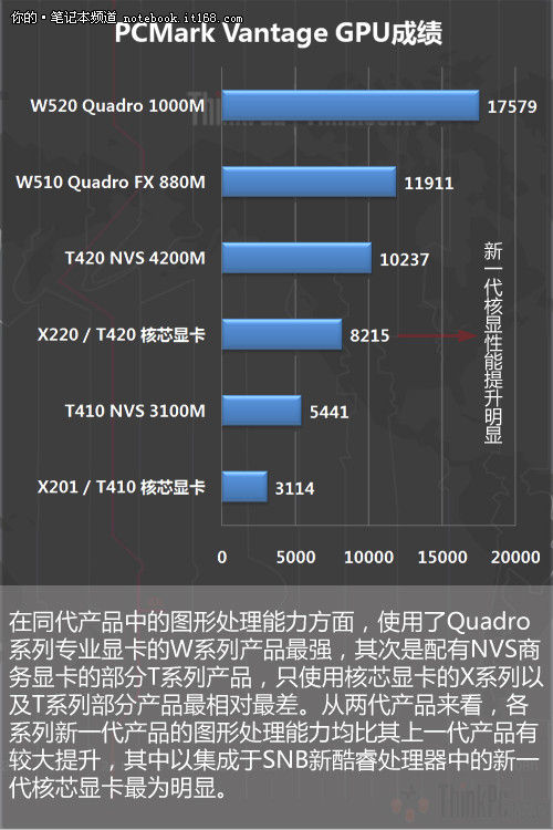 从低端到高端,这3个系列的笔记本在处理器方面的选择上,几乎囊括了新旧两代酷睿i系列处理器的全系列产品,其中X系列与T系列的机型均使用了双核芯的处理器,而W系列则是使用了四核芯处理器以及一部分较高等级的双核芯处理器。为了使读者对这两代处理器的基准性能有一个直观的认识,在这里我们将其中绝大部分处理器的性能根据基准测试软件的成绩进行了排列。