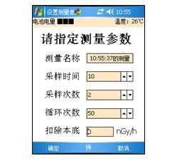 图8 测量名称:为方便记忆,每次测量都可指定一个名称。系统按照测量开始的时间自动生成一个名称,用户可自行更改。不同的测量可以重名,但不建议这么做。 采样时间:测量的最小时间间隔,单位是秒。选择范围:1-1000秒。采样次数:单个循环的采样个数。选择范围:1-100次。每次循环的测量时间 = 采样时间 × 采样次数 循环次数:单个循环的重复次数。选择范围:1-1000次。总的测量时间 = 采样时间 × 采样次数 × 循环次数。 扣除本底:为特殊目的设置的,消除天然本底对测量结果的影响,可预先测量天然本底的值,在此输入。每次测量的测量值将自动扣除天然本底。点“确定”开始测量,点“取消”回到主菜单3-2预测量: 在进行第一次正式测量之前,为保证探测器工作在稳定状态,需要预测量,当误差达到一个较低的水平,可认为已具备正式测量的条件如图9,10