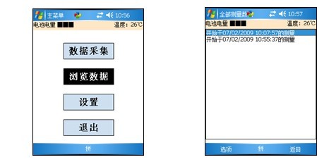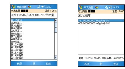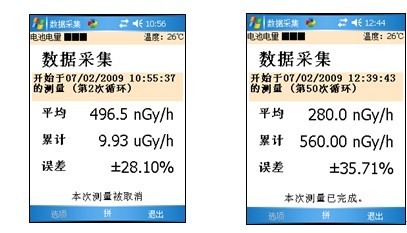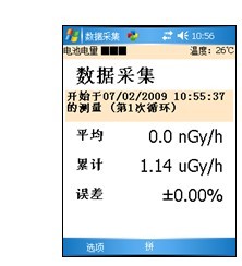 图11 “数据采集”下方显示本次测量的名称与当前循环的序号。 “平均”显示上次循环的平均值。第一次循环因为没有上次循环,这个值总为零。 “累计”显示测量开始以来的累积剂量率。这个值单调增加,实时更新。 “误差”显示上次循环的误差,也称变异系数。第一次循环因为没有上次循环,这个值总为零。 点击屏幕左下角的“选项”,出现下图的菜单: