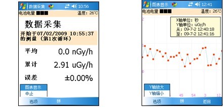 图12 图13 在给出测量数据的同时,还给出“图表显示”将测量数据实时显示在图表上(称为实时图表显示),如图13所示: “X轴单位”显示横轴,即时间轴的单位,可能是“秒”、“分钟”、“小时”、“日”、“月”或“年”。 “Y轴单位”显示纵轴,即测量值的单位,可能是“nGy/h”,“uGy/h”,“mGy/h”或“Gy/h”。如果在软件设置中将显示单位设置为“Sv/h”,这里则显示对应的希伏特/小时读数。 “从”和“至”显示图表的起始和结束时间。“从”代表屏幕最左边的数据对应的测量时间,“至”代表屏幕最右边数据对应的测量时间。受屏幕尺寸所限,横轴无法显示完整的时间,只能将时间的最低位显示出来。详情可参考“数据浏览”—“图表显示”一节。 点击屏幕左下角的“选项”,调出选项菜单,可进行纵向的缩放,以更好的观察数据的变化趋势。 点击右下角的“返回”可回到测量界面。 由图12可见,测量界面的“选项”菜单第二项是“中止”,选择此项将中止正在进行的测量,如图14所示。点右下角的“退出”返回主菜单。已测得的数据将被保留,可在“数据浏览”功能中查看。当所有的循环测量完毕,出现文字提示如图15所示。点“退出”返回主菜单