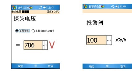图35 图36 此页面调节探测器的工作电压。调节范围是-500V—-1250 V 这里共有两种工作电压:“正常状态”和“超量程”。正常状态即正常测量时的工作电压,超量程则是当辐射强度较大时,为得到准确读数,探测器自动将工作电压调整到这个值重新测量。这两种工作电压是独立调节的,但超量程电压必须低于正常电压。点“确定”使电压设置生效,并离开此页面。在测量过程中,为保证操作人员安全,设备具有自动报警功能,当读数超过报警阈时将发出警告。报警阈的调节范围是1~10000 uGy/h。如图365-3语言