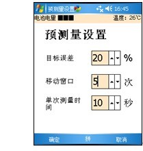 图 40 在这里设置预测量参数。移动窗口的值为N,目标误差为E,测量时间为T。预测量的方法如下:5-8-1进行N次测量,每次测量的时间为T。5-8-2对当前测量(含)之前的N次测量的误差求平均,均值记为EA,如果EA < E,预测量结束,进入正式测量。否则进行下一次测量。5-8-3重复步骤5-8-2。 一般而言,目标误差不能设得太小,否则测量次数会显著增加,甚至最终无法收敛到这个误差。6。退出软件:在主菜单选择“退出”离开本软件。所有测量数据和配置将被保存。