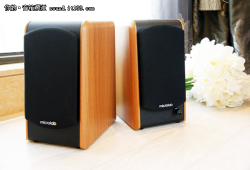 麦博B-77音箱整体为长方体设计,侧面板为直角梯形,音箱前面板与竖直平面稍稍呈一定角度,单元指向稍稍向上,更加适合近声场条件使用。音箱侧板的木纹非常真实,其他表面的皮革材质也有不错的触感。音箱设计有布质网罩,能够有效保护发音单元。