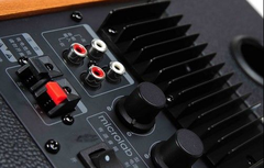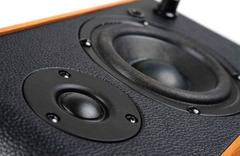 麦博B-77在外观工艺方面非常到位,采用仿真木纹与皮革表面的搭配,颇有些HiFi音箱的味道,整体风格经典复古,这种气息是我一直寻找的记忆回味,能够满足一部分对外观比较挑剔的用户。音箱采用仿真木纹与皮革表面的搭配,整体风格复古严谨,颇有些HiFi音箱的味道。