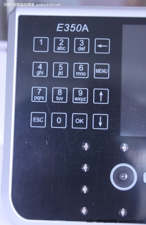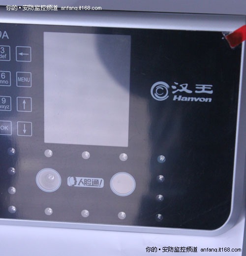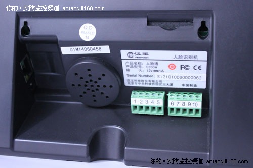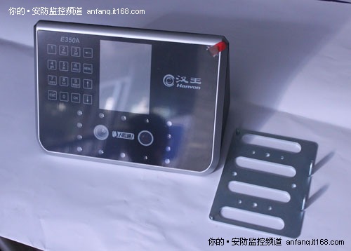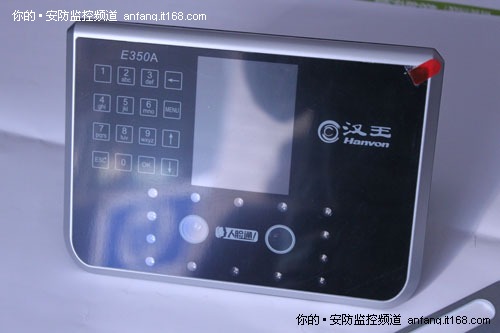 该机设计比较另类的是,一般触摸键设置在考勤机的左侧,当然也不乏更为另类C220右侧的也有,汉王E350A选择了适中的位置,另外采用了TFT彩色屏幕用来帮助识别者进行操作,3.5英寸TFT彩屏, 6万5千色高彩, 320×240分辨率的参数还是相对比较豪华的。在屏幕的的正面靠下是两个摄像头,脸部的识别功能主要由它们来完成,两个摄像头的运用能够更好的立体式的读取人脸。