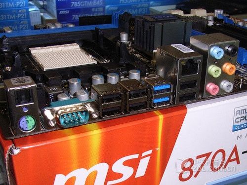 微星870-G54-H在背板部分提供了PS/2键鼠两用接口,光纤,COM,6个USB2.0,以及网络,音频接口,此外还通过NEC USB3.0芯片提供了2个蓝色的USB3.0接口,种类丰富,数量充足。