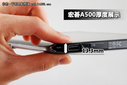 内置USB接口的宏?A500虽然是三款中最厚的,但是也控制在14mm以内,差距不明显