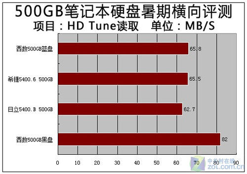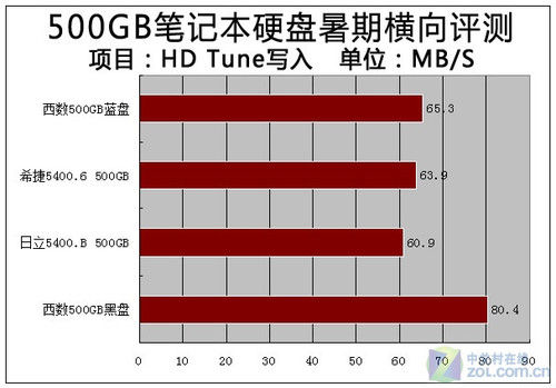 在平均写入速度方面,西数500GB黑版硬盘同样表现最为出色,而西数500GB蓝版硬盘和希捷5400.6成绩依然比较接近,不过日立500GB本盘并没有落后太多,可谓旗鼓相当。