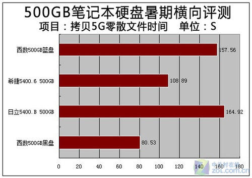 在实际文件拷贝测试中,无论是拷贝单个大容量文件还是零散文件,日立500GB本盘都表现不佳,其中拷贝5GB零散文件用时164秒,而拷贝4GB高清视频则用时128秒。不过在测试中我们发现,西数7200转黑版硬盘并没有表现像底层测试那样出色,成绩同希捷5400.6 500GB硬盘成绩相仿。