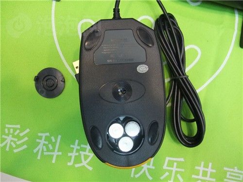 多彩T8游戏鼠标机身较大,外形采用对称式设计,鼠标的左侧贴有防滑橡胶,而右侧则使用的是磨砂表面,因此也更加适合右手使用。在鼠标的顶端设置了一个银灰色的三角形按钮,可以对分辨率进行1000/1600/2400dpi调节,满足用户对于精度和速度的不同需求。同时还在鼠标的底部设置了一个圆形的配重仓,内部可以放置3颗10g的配重,提供更好的操控感。