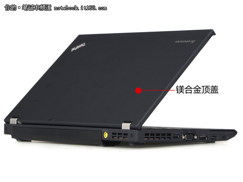 为了延续X系列产品机身的高度安全性,X220在机身用料方面依旧采用了大量的镁合金,其顶盖外侧与底壳全部使用了这一高强度原料,这使得该机在闭合状态下的安全性能十分的出色。在测试中我们将手掌放在其顶盖上用力按压只出现了小幅度的下沉现象,这说明该机的顶盖可以对屏幕起到较好的保护效果。另外我们在下图中看到,与前作不同的是X220将电源插孔设置在了机身后侧,这样的设计方式也使得左右接口的排布更加宽松。