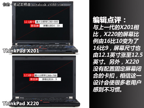 从下面的对比图中可以很明显的看到X220与X201在屏幕比例上的区别,X220为用户配置了一块16比9的12.5英寸雾面屏,随着潮流及应用需求的改变,16比9的屏幕比例也是最新一代商务产品的特色,而雾面屏加上磨砂质感的边框可以在使用中出色应对复杂的光源环境,为用户带来出色的视觉体验。另外,X220没有配置固定屏幕闭合的卡扣,从各论坛上的讨论内容来看,这使得许多老“粉丝”都感到不习惯。