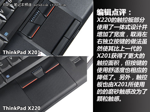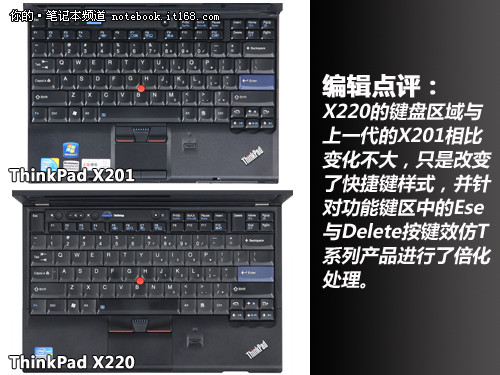 由于屏幕比例的改变,X220的机身与X201相比更宽,这使得在同样配置了ThinkPad系列标志性全尺寸键盘的前提下,X220的键盘区边框更宽并为其带来了更好的防护性。在按键使用手感依旧出色的同时,其键盘区域与老款产品相比也变化不大,从对比图中可以看到该机在这部分只是改变了快捷键的样式,并针对功能键区中的Ese与Delete键效仿T系列产品进行了倍化处理。同样是由于模具比例的改变,原本就不富裕的掌托部分变得更窄,这也迫使X220在保留了触控板的同时,使用一体式设计取消掉了独立按键,以达到节省空间的目的,同时由于触控板加宽的原因其实际有效面积也变得更大。