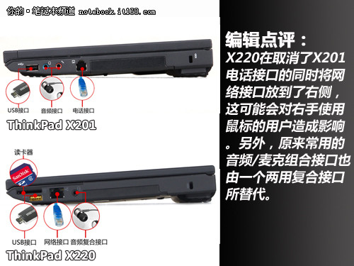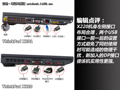 X220在接口方面一共为用户提供了3个USB 2.0接口(1个支持关机供电)、1个DP接口、1个VGA接口、1个RJ-45接口、1个音频/麦克复合接口、 1个Express卡槽以及一个多合一读卡器,这些接口在布局方面比较合理,各端口之间不会因为距离太近而影响到同时使用,然而将网络接口放到机身右侧的做法则可能会对右手使用鼠标的用户造成影响。