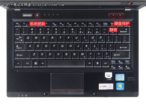 昭阳K27的快捷功能键以及其它的指示灯都集中到了键盘上方的条形区域内,中间部分集中着硬盘状态、数字状态、大小写状态、硬盘状态的指示灯,并提供了联想笔记本最为常见的系统恢复功能键,避免系统在任何情况下由于软件崩溃带来的麻烦。而在键盘上方设计了系统拯救、静音以及硬盘保护功能键。
