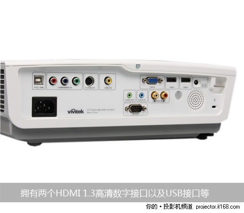 接口方面,丽讯H1080配备了两个HDMI 1.3高清数字接口、15针的D-Sub接口、RCA立体声输入接口、S-Video接口、普通RCA视频接口、USB接口和电脑声卡上常见的3.5mm Mini-Jack音频输入输出接口,12V Trigger和RS232中控接口。